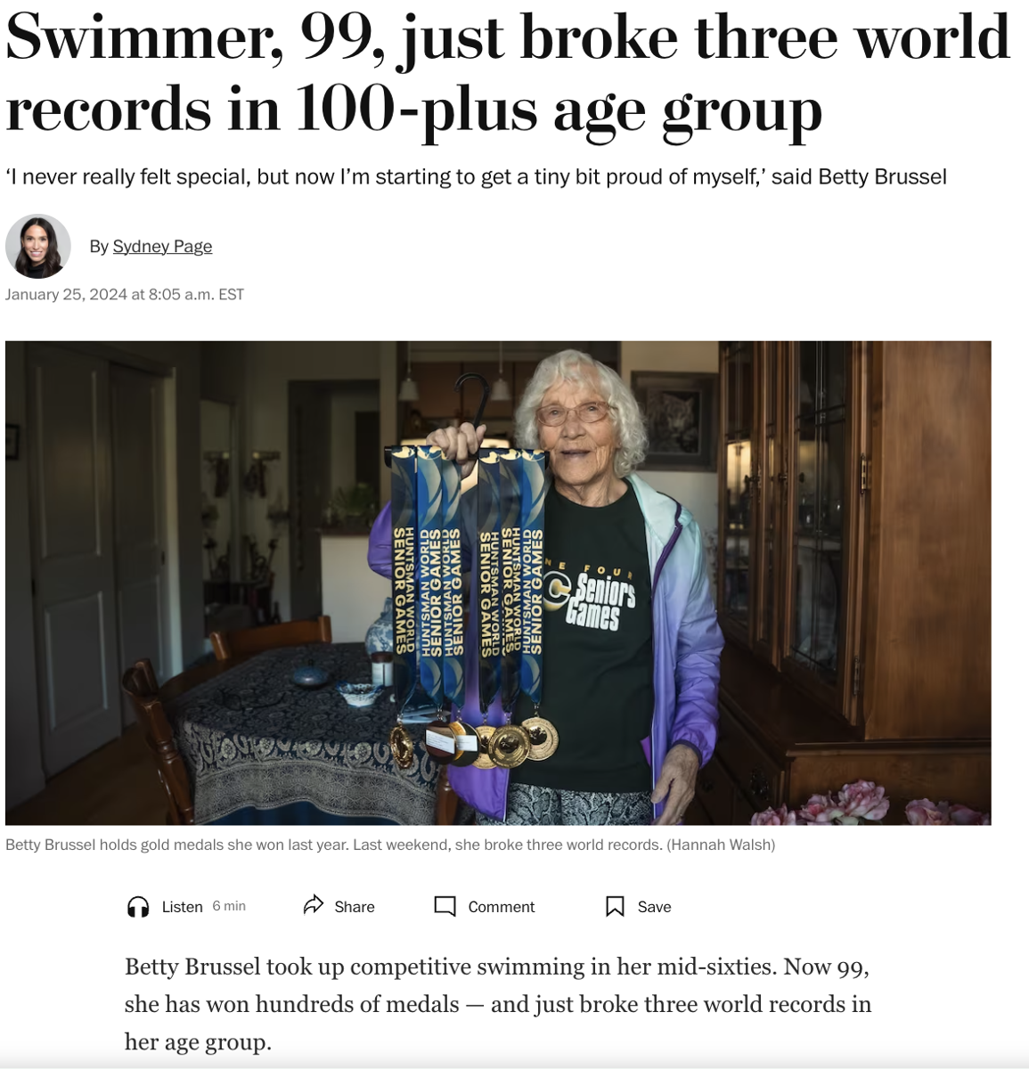 Betty Brussel took up competitive swimming in her mid-sixties. Now 99, she has won hundreds of medals — and just broke three world records in her age group.