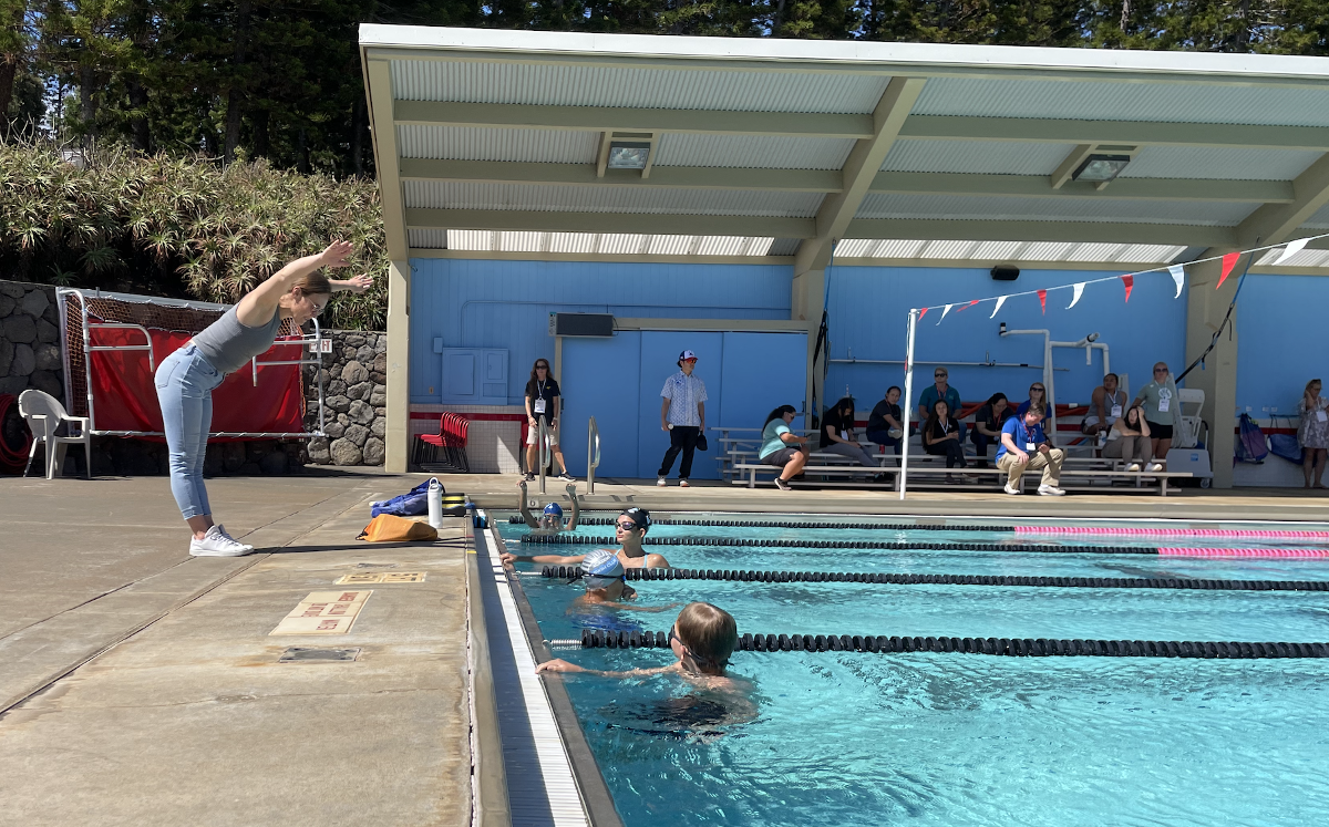 PHOTO: Coach Laura from Alto Swim Club working with ASC swimmers on butterfly, 4/20/24.